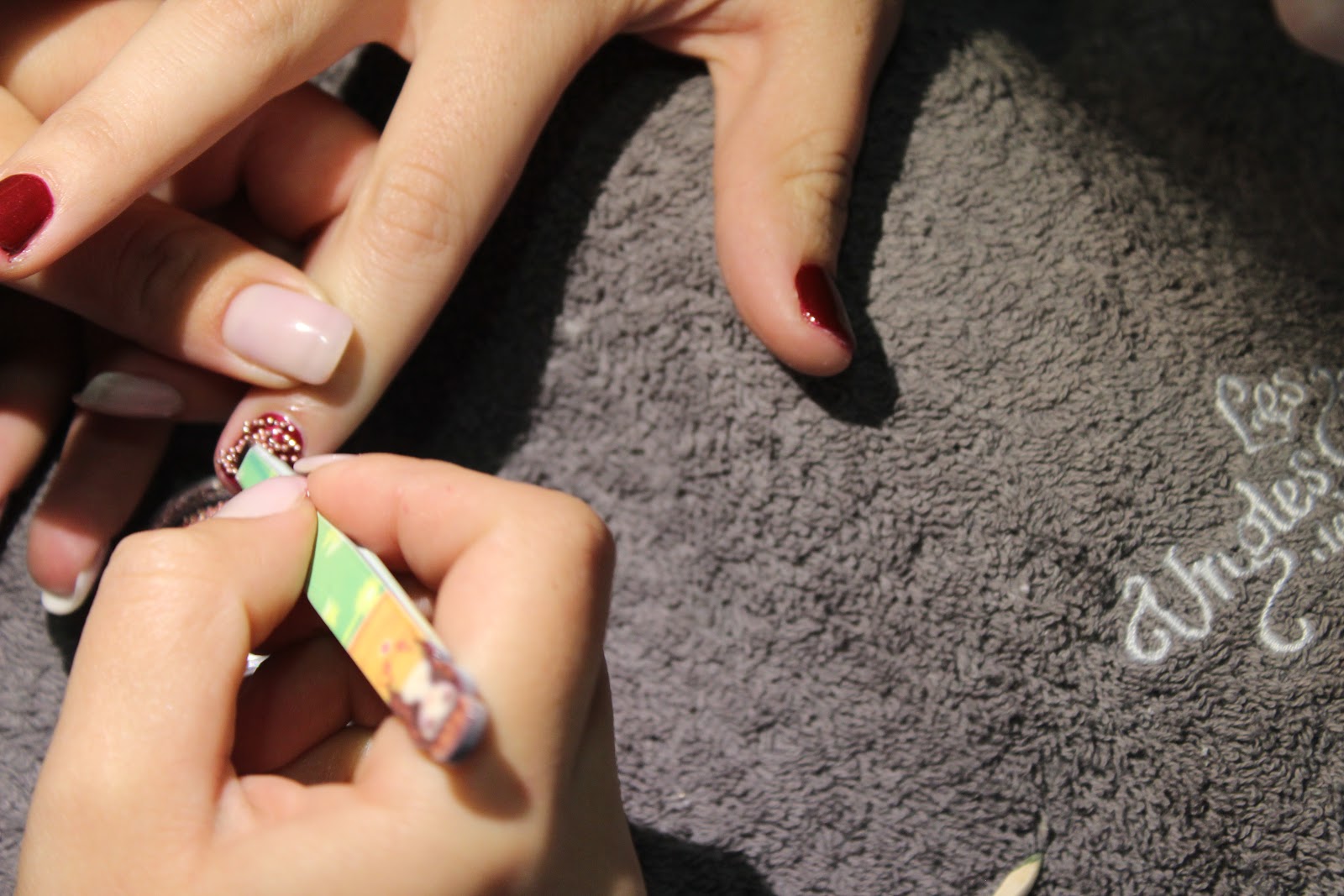 Increíble pero cierto que ésta es la primera vez que me hacen la manicura con esmaltes de «shellac», tenía curiosidad por ello y acepté encantada poder llevar unas uñas perfectas para The Shopping Night. Y así fue, para la ocasión escogí un tono granate y decoración en un dedo de cada mano de bolitas rositas y más abajo veréis el resultado.